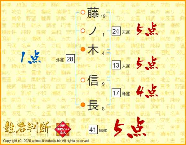 藤(19画)ノ(1画)木(4画) 信(9画)長(8画)