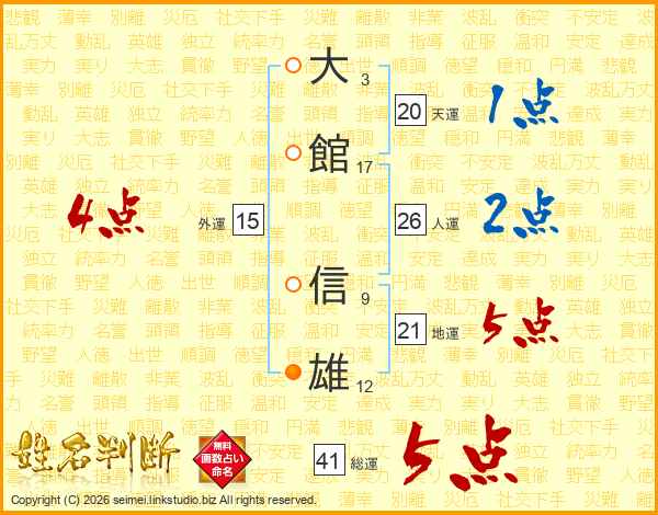 大(3画)館(17画) 信(9画)雄(12画)