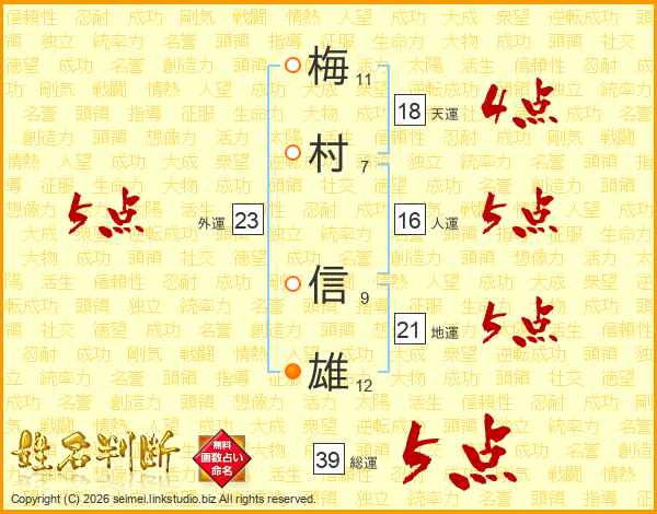 梅(11画)村(7画) 信(9画)雄(12画)
