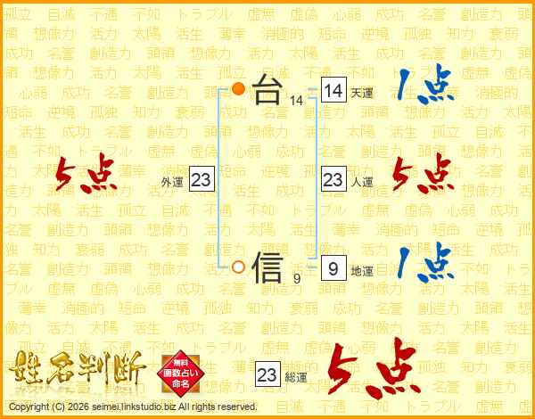 生活面を象徴する運勢です。外部から受ける影響力を表し、結婚運、家庭運や職場、環境への順応性を表します。総運から人運を引いた画数。姓や名が1文字の場合を除く。