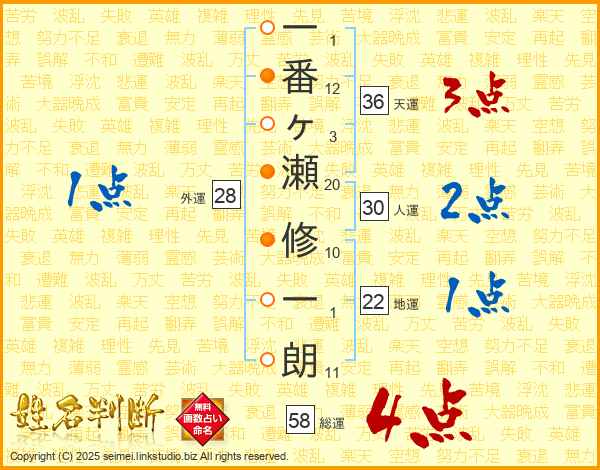 一番ヶ瀬修一朗さんの総運は58画の4点!