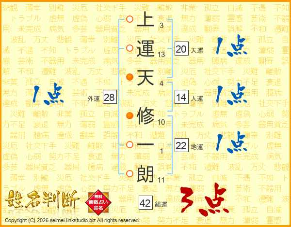 上運天修一朗さんの人運は14画の1点!