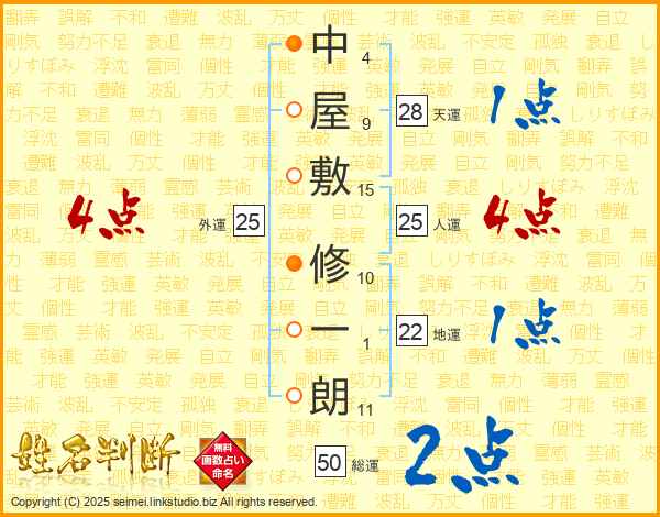 中(4画)屋(9画)敷(15画) 修(10画)一(1画)朗(11画)