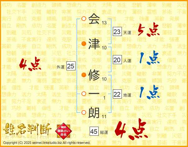 会(13画)津(10画) 修(10画)一(1画)朗(11画)