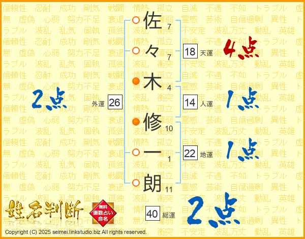 佐(7画)々(7画)木(4画) 修(10画)一(1画)朗(11画)