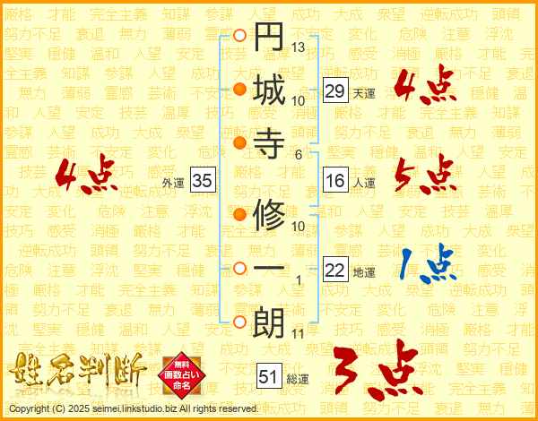 円(13画)城(10画)寺(6画) 修(10画)一(1画)朗(11画)