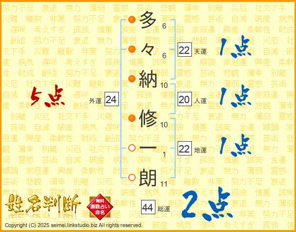 多(6画)々(6画)納(10画) 修(10画)一(1画)朗(11画)