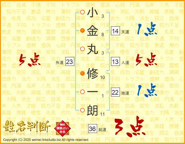 小(3画)金(8画)丸(3画) 修(10画)一(1画)朗(11画)