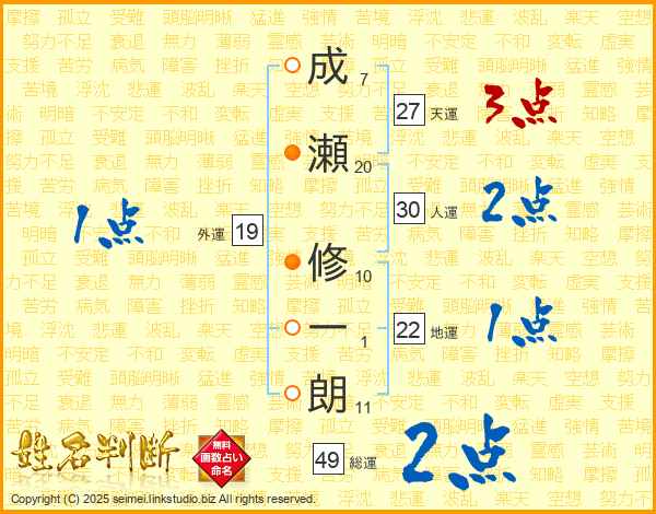 成(7画)瀬(20画) 修(10画)一(1画)朗(11画)