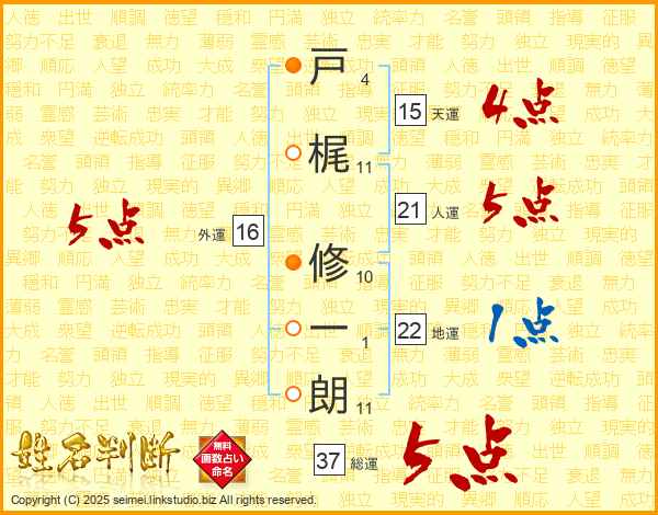 戸(4画)梶(11画) 修(10画)一(1画)朗(11画)