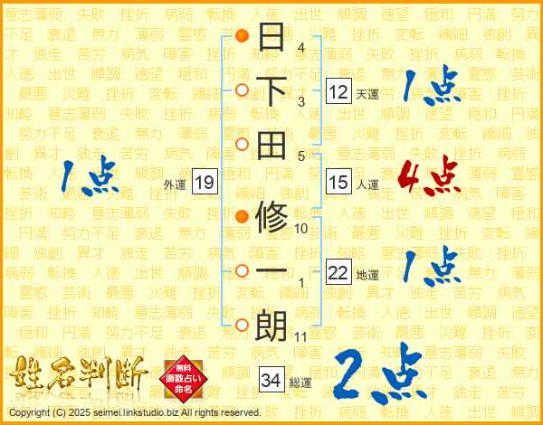 日(4画)下(3画)田(5画) 修(10画)一(1画)朗(11画)