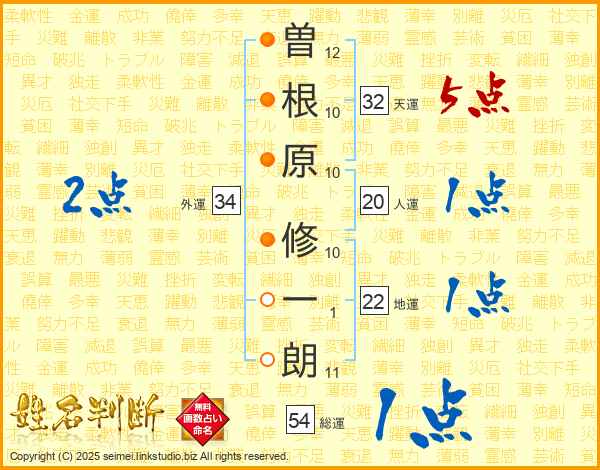 曽(12画)根(10画)原(10画) 修(10画)一(1画)朗(11画)