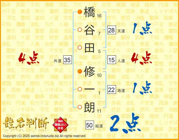 橋(16画)谷(7画)田(5画) 修(10画)一(1画)朗(11画)
