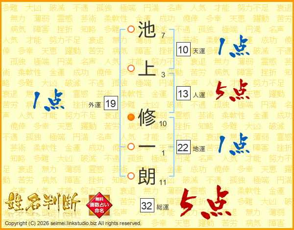 生活面を象徴する運勢です。外部から受ける影響力を表し、結婚運、家庭運や職場、環境への順応性を表します。総運から人運を引いた画数。姓や名が1文字の場合を除く。