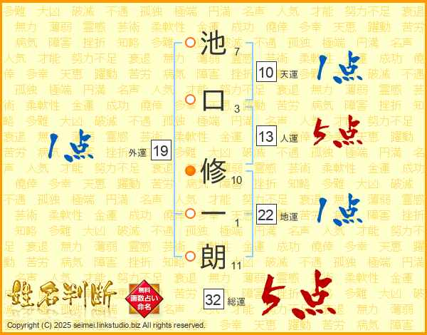 生活面を象徴する運勢です。外部から受ける影響力を表し、結婚運、家庭運や職場、環境への順応性を表します。総運から人運を引いた画数。姓や名が1文字の場合を除く。