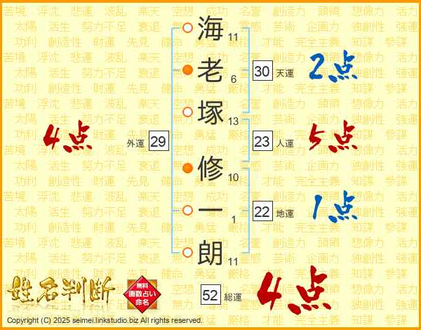 海(11画)老(6画)塚(13画) 修(10画)一(1画)朗(11画)