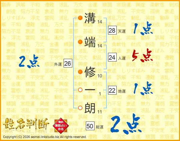 溝(14画)端(14画) 修(10画)一(1画)朗(11画)