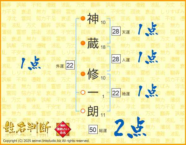 神(10画)蔵(18画) 修(10画)一(1画)朗(11画)
