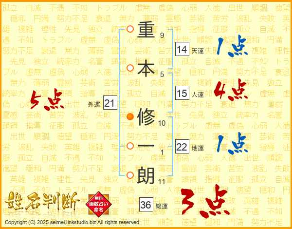 重(9画)本(5画) 修(10画)一(1画)朗(11画)