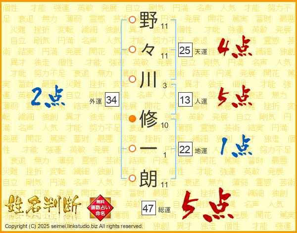 野(11画)々(11画)川(3画) 修(10画)一(1画)朗(11画)