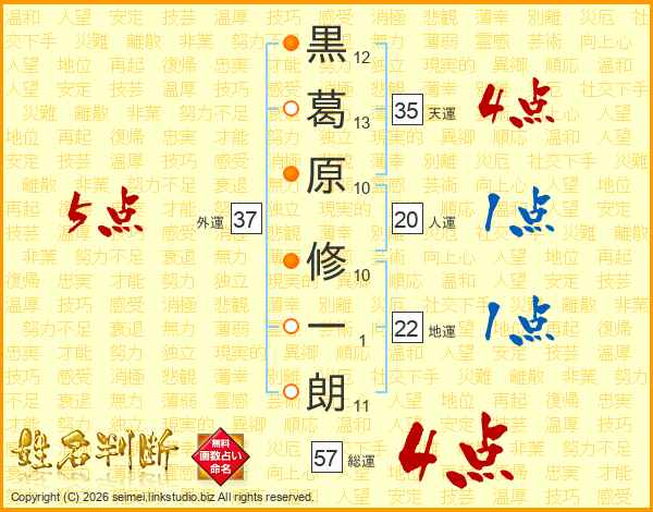 黒(12画)葛(13画)原(10画) 修(10画)一(1画)朗(11画)