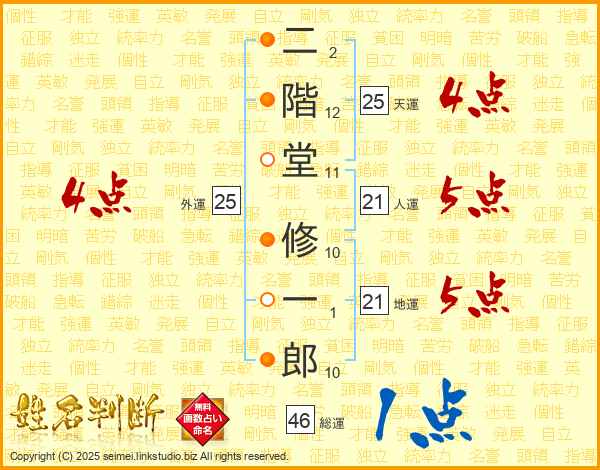 二(2画)階(12画)堂(11画) 修(10画)一(1画)郎(10画)