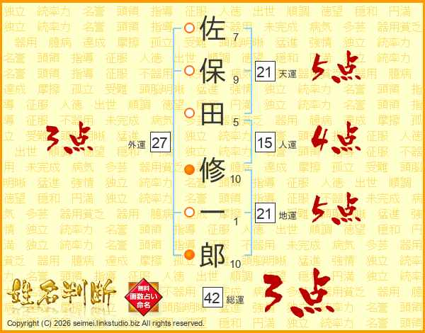佐(7画)保(9画)田(5画) 修(10画)一(1画)郎(10画)