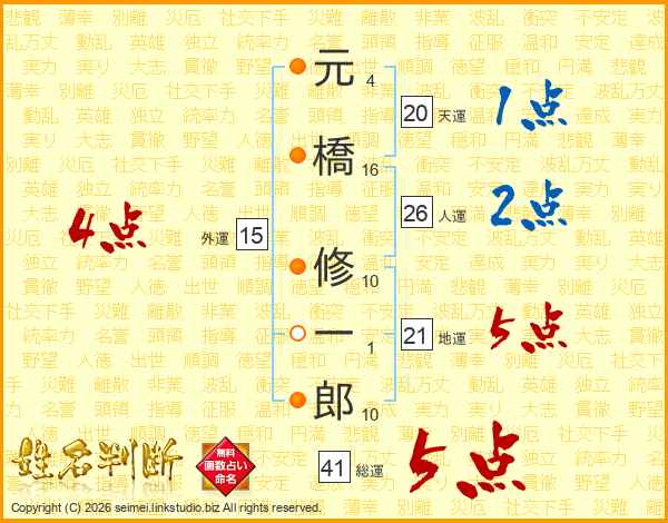 元橋修一郎さんの総運は41画の5点!