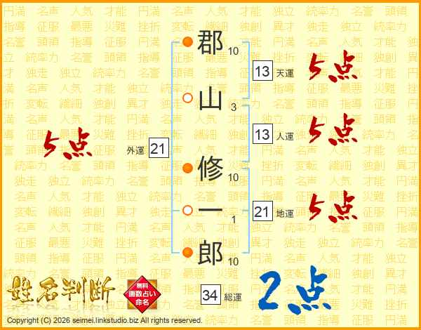 郡(10画)山(3画) 修(10画)一(1画)郎(10画)