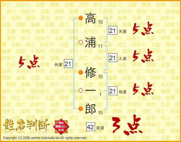 高(10画)浦(11画) 修(10画)一(1画)郎(10画)