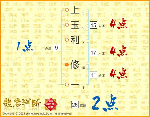 上(3画)玉(5画)利(7画) 修(10画)一(1画)