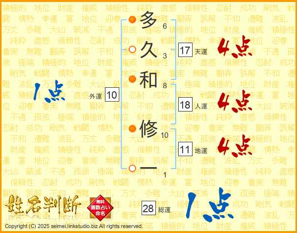 多(6画)久(3画)和(8画) 修(10画)一(1画)