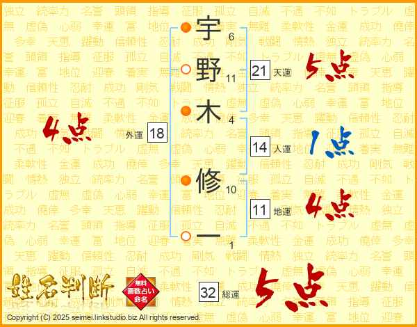 宇野木修一さんの総運は32画の5点!
