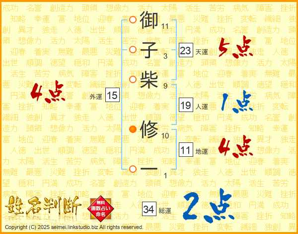 御(11画)子(3画)柴(9画) 修(10画)一(1画)