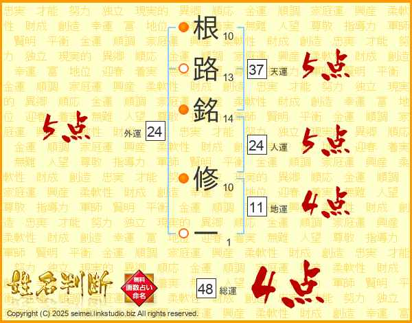 根路銘修一さんの総運は48画の4点!