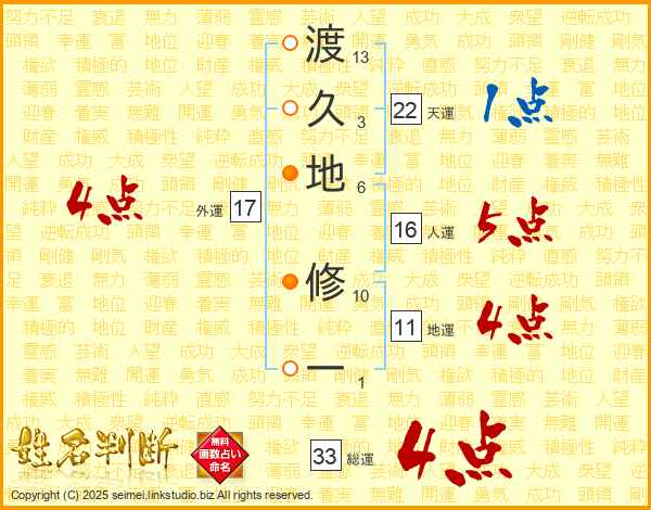 渡(13画)久(3画)地(6画) 修(10画)一(1画)