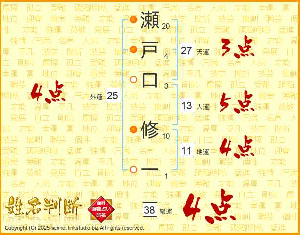 瀬戸口修一さんの総運は38画の4点!