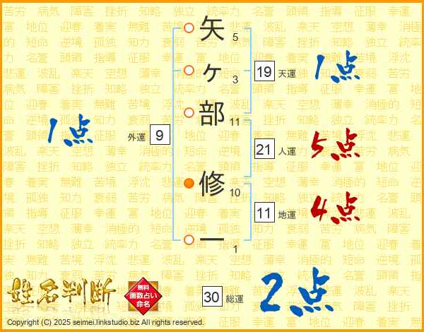 矢ヶ部修一さんの総運は30画の2点!