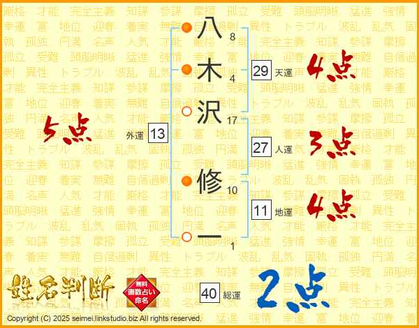八(8画)木(4画)沢(17画) 修(10画)一(1画)