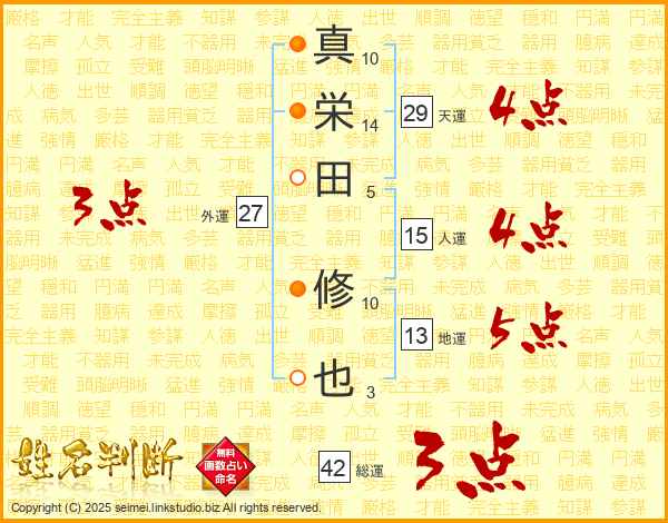 真(10画)栄(14画)田(5画) 修(10画)也(3画)