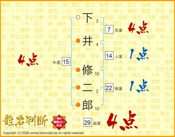 下井修二郎さんの総運は29画の4点!