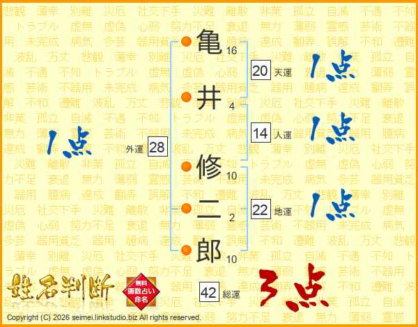 亀井修二郎さんの総運は42画の3点!