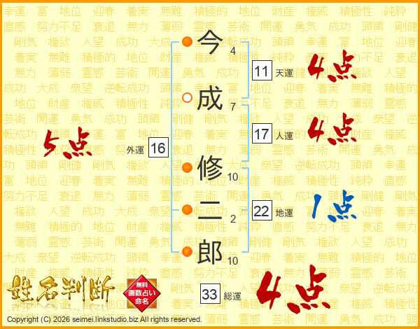 今(4画)成(7画) 修(10画)二(2画)郎(10画)
