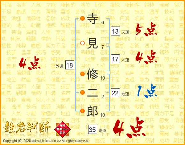 寺(6画)見(7画) 修(10画)二(2画)郎(10画)