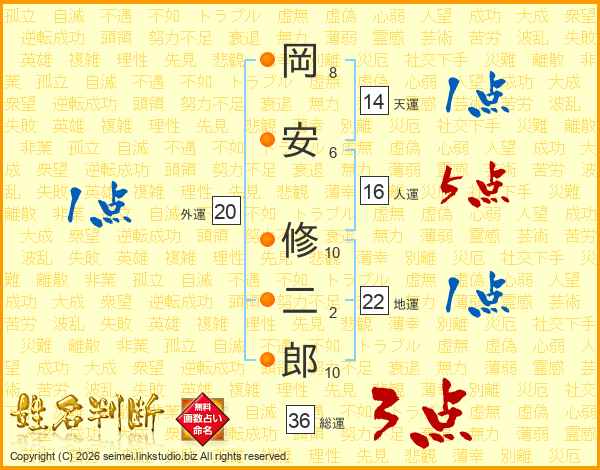 岡(8画)安(6画) 修(10画)二(2画)郎(10画)