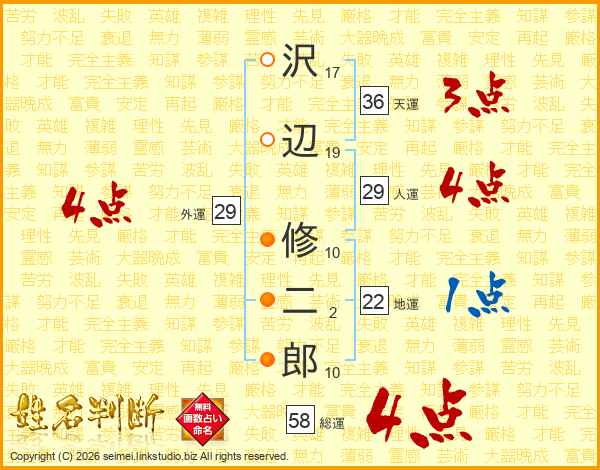 沢辺修二郎さんの総運は58画の4点!