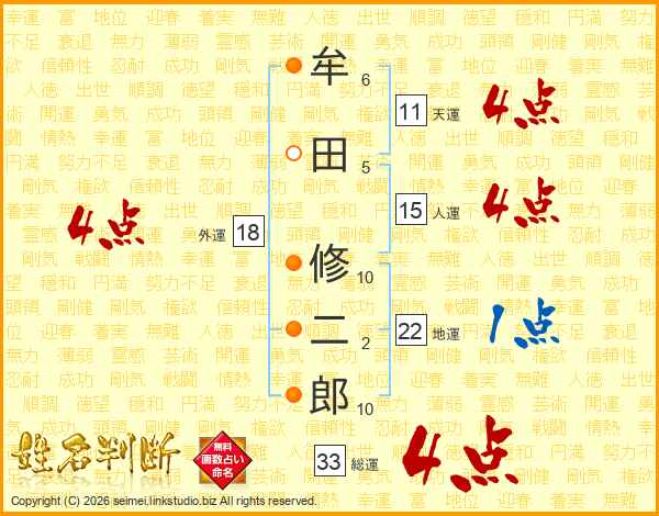 牟(6画)田(5画) 修(10画)二(2画)郎(10画)