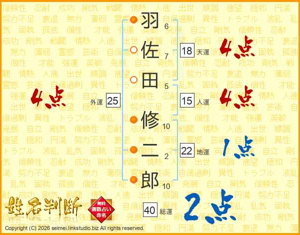 羽佐田修二郎さんの総運は40画の2点!