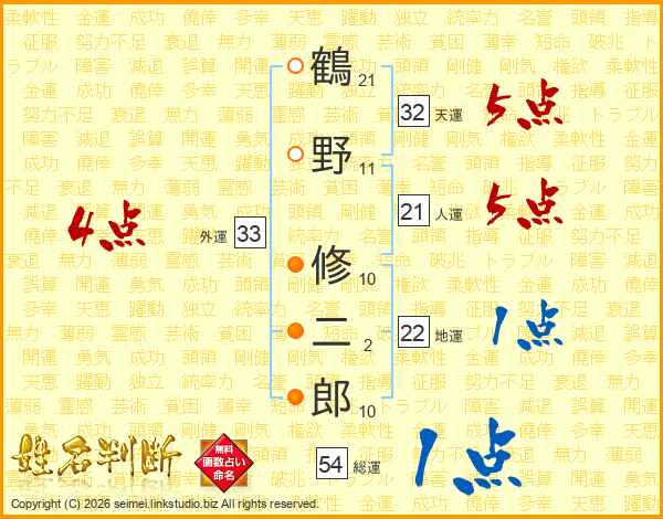 鶴野修二郎さんの総運は54画の1点!
