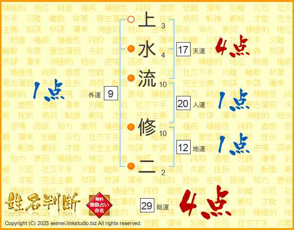 上(3画)水(4画)流(10画) 修(10画)二(2画)